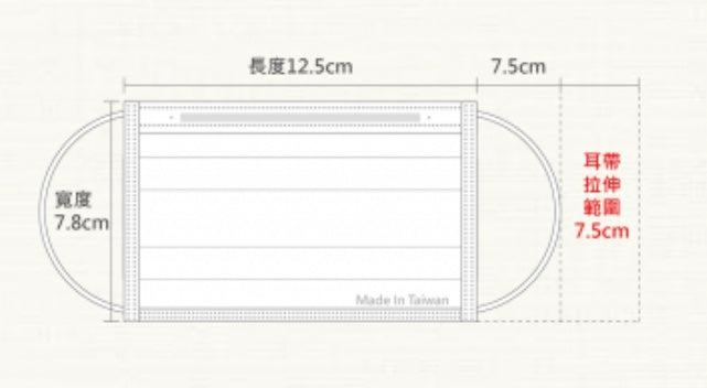 【口罩尺寸】長 12.5 公分 x 寬 7.8 公分 ± 0.5 公分