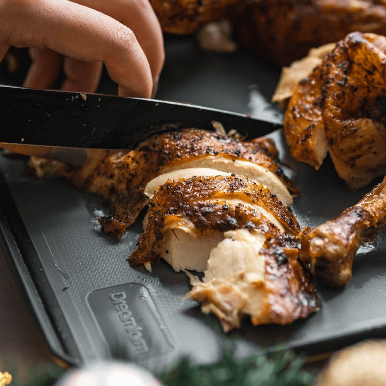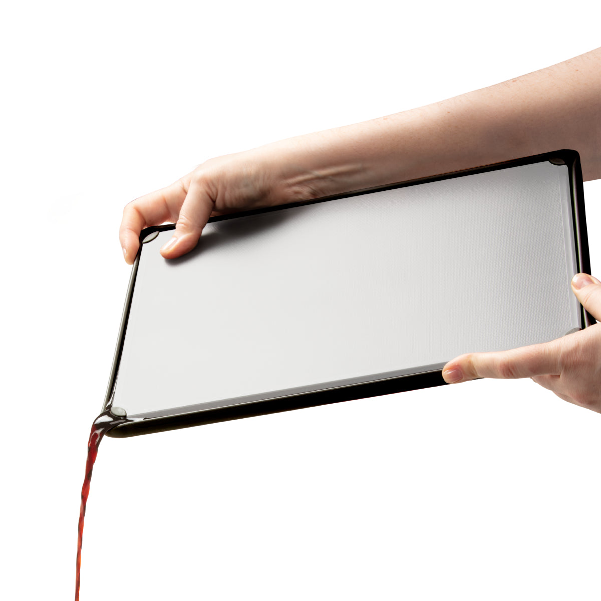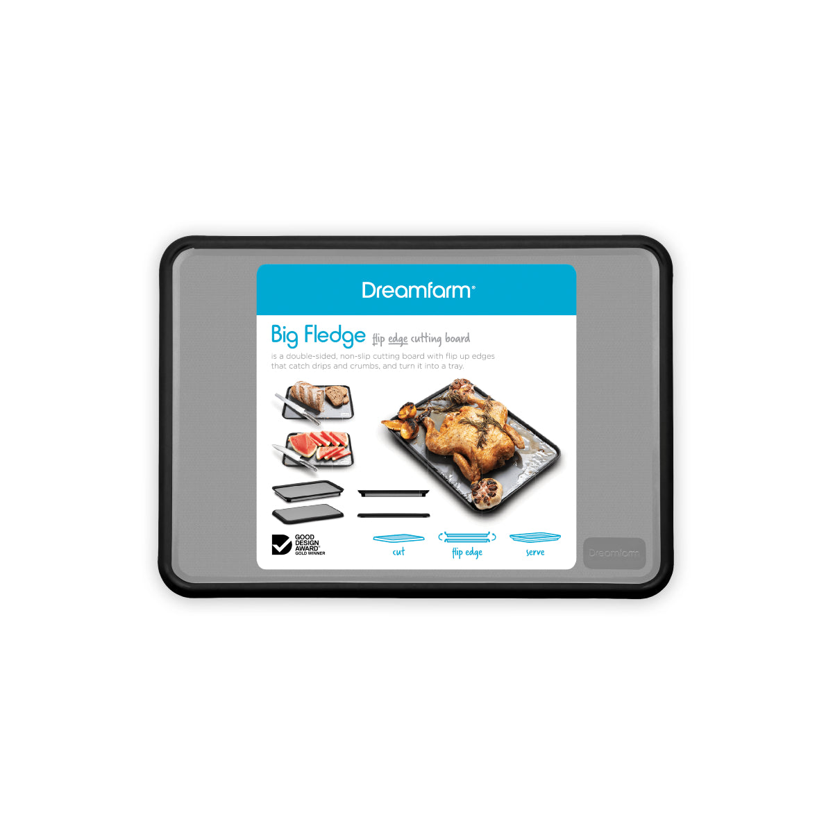 Big Fledge is the world’s best cutting board. Fledge has unique flip up edges that prevent food from falling or rolling off the sides when being transported to a pot, bowl or table for serving. Both Fledge and the double-sized Big Fledge also have non-slip rubber feet on both sides, knife-friendly patterns on both sides and a generous juice groove for carving on the underside.