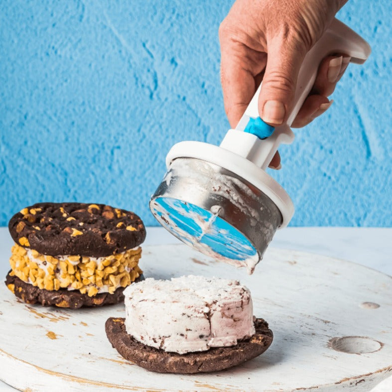 Icepo is the ice cream scoop that serves a perfect ½ cup portion and creates instant ice cream sandwiches. Icepo’s simple design sits comfortably in one hand and is easy to use. Just push Icepo into your ice cream, twist to cut your portion using Icepo’s stainless steel cutter and high-tensile wires, and eject onto your cookie for a no-prep treat.