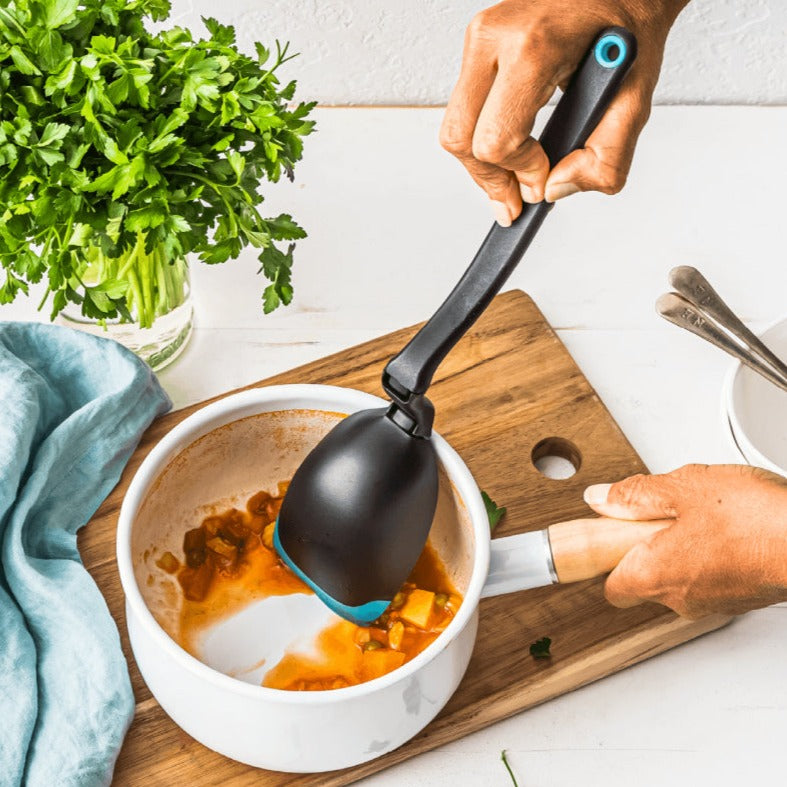Spadle is the incredibly versatile spoon that twists into a ladle. A simple twist of Spadle’s handle cleverly transforms it into a ladle perfect for serving soups or stews.